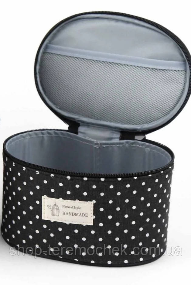 | тип призначення | Косметичка-кейс чорна в горох, жіноча дорожня сумка органайзер для косметики 20 х15.5 х12 см |